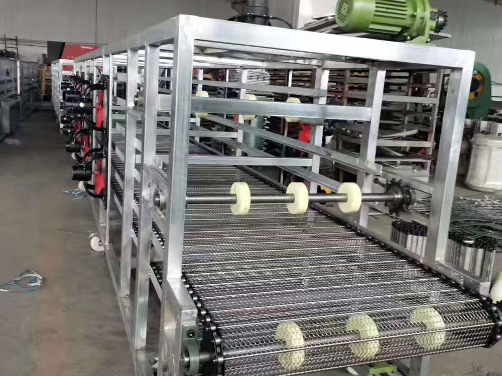 链网是有网带边缘镶链条,链条附在从网条穿过的支轴上面,网面密度由加工产品的尺寸决定。